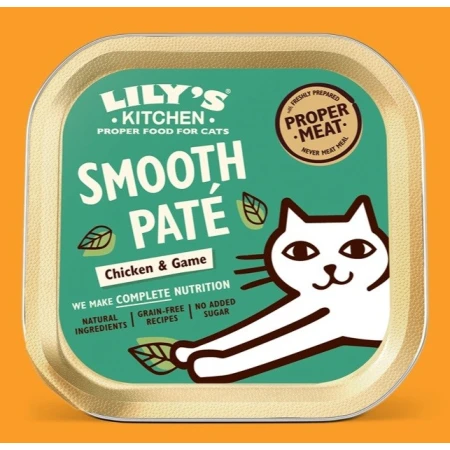 Le pâté lisse de poulet et de gibier Lily’s Kitchen est une nourriture humide pour chats faite d’ingrédients naturels, sans céréales ni sucres ajoutés. Les chats l’adorent car il contient de la viande fraîchement préparée et des abats.